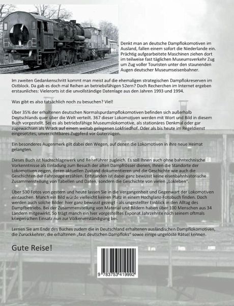 Denkt man an deutsche Dampflokomotiven im Ausland, fallen einem sofort die Niederlande ein. Prächtig aufgearbeitete Maschinen ziehen dort im teilweise fast täglichen Museumsverkehr Zug um Zug voller Touristen unter den staunenden Augen deutscher Museumseisenbahner.Im zweiten Gedankenschritt kommt man meist auf die ehemaligen strategischen Dampflokreserven im Ostblock. Da gab es doch mal Reihen an betriebsfähigen 52ern? Doch Recherchen im Internet ergeben erstaunliches: Vielerorts ist die unvollständige Datenlage aus den Jahren 1993 und 1994. Und Rumänien? Polen? Italien, Frankreich, Thailand? In insgesamt 34 Ländern werden 367 Normalspurdampflokomotiven mit deutschen Einsatzwurzeln museal erhalten.Alle diese Lokomotiven werden mit Wort und Bild in diesem Buch vorgestellt. Sei es als betriebsfähige Museumslokomotive, als stationäres Denkmal oder gar zugewachsen als Wrack auf einem weitab gelegenen Lokfriedhof. Oder als bis heute im Regeldienst eingesetztes, unverzichtbares Zugpferd vor Güterzügen.Ein besonderes Augenmerk gilt dabei den Wegen, auf denen die Lokomotiven in ihre neue Heimat gelangten. Dieses Buch ist Nachschlagewerk und Reiseführer zugleich. Es soll Ihnen auch ohne bahntechnische Vorkenntnisse als Einladung zum Besuch der alten Dampfrösser dienen, Ihnen die Standorte der Lokomotiven zeigen, deren aktuellen Zustand dokumentieren und die Geschichte wie auch die Geschichten der Fahrzeuge erzählen. Entstanden ist dabei ganz bewusst keine eisenbahnhistorische Zusammenstellung von Tabellen und Daten, sondern die Geschichte von vielen Lokleben.Über 530 Fotos von gestern und heute lassen Sie in die Vergangenheit und Gegenwart der Lokomotiven eintauchen. Manch ein Bild würde vielleicht keinen Platz in einem Hochglanz-Fotobuch finden. Doch werden auch solche Bilder hier ganz bewusst gezeigt - als ungestellter Einblick in den Alltag des Dampfbetriebs. Bei der Zusammenstellung von Material und Bildern haben über 100 Menschen aus 34 Ländern mitgewirkt. So trägt manch ein hier vorgestelltes Exponat Jahrzehnte nach seinem oftmals kriegerischen Einsatz nun zur Völkerverständigung bei.Lernen Sie am Ende des Buches zudem die in Deutschland erhaltenen ausländischen Dampflokomotiven, die Zurückkehrer, die erhaltenen fast deutschen Dampfloks sowie einige ungelöste Rätsel kennen.