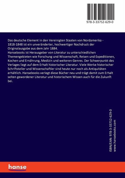 Das deutsche Element in den Vereinigten Staaten von Nordamerika - 1818-1848 ist ein unveränderter, hochwertiger Nachdruck der Originalausgabe aus dem Jahr 1884.