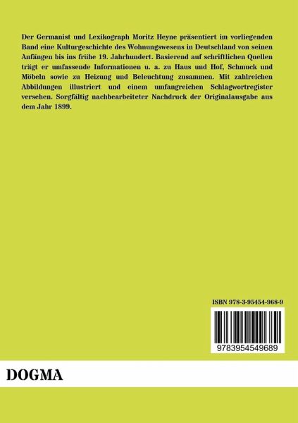 Der Germanist und Lexikograph Moritz Heyne präsentiert im vorliegenden Band eine Kulturgeschichte des Wohnungswesens in Deutschland von seinen Anfängen bis ins frühe 19. Jahrhundert. Basierend auf schriftlichen Quellen trägt er umfassende Informationen u. a. zu Haus und Hof, Schmuck und Möbeln sowie zu Heizung und Beleuchtung zusammen. Mit zahlreichen Abbildungen illustriert und einem umfangreichen Schlagwortregister versehen. Sorgfältig nachbearbeiteter Nachdruck der Originalausgabe aus dem Jahr 1899.
