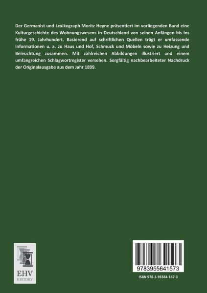Der Germanist und Lexikograph Moritz Heyne präsentiert im vorliegenden Band eine Kulturgeschichte des Wohnungswesens in Deutschland von seinen Anfängen bis ins frühe 19. Jahrhundert. Basierend auf schriftlichen Quellen trägt er umfassende Informationen u. a. zu Haus und Hof, Schmuck und Möbeln sowie zu Heizung und Beleuchtung zusammen. Mit zahlreichen Abbildungen illustriert und einem umfangreichen Schlagwortregister versehen. Sorgfältig nachbearbeiteter Nachdruck der Originalausgabe aus dem Jahr 1899.