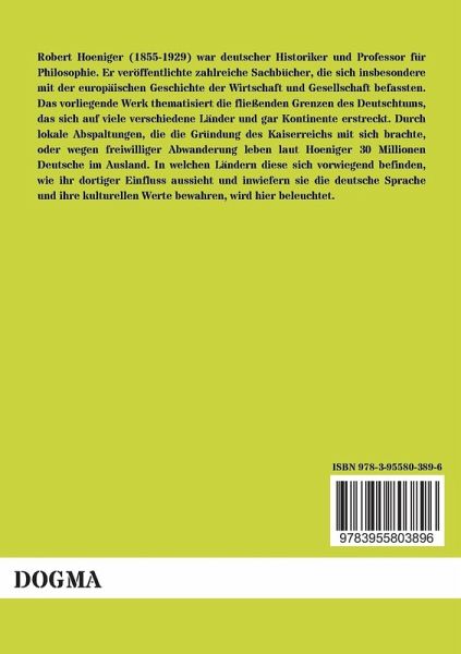 Robert Hoeniger (1855-1929) war deutscher Historiker und Professor für Philosophie. Er veröffentlichte zahlreiche Sachbücher, die sich insbesondere mit der europäischen Geschichte der Wirtschaft und Gesellschaft befassten. Das vorliegende Werk thematisiert die fließenden Grenzen des Deutschtums, das sich auf viele verschiedene Länder und gar Kontinente erstreckt. Durch lokale Abspaltungen, die die Gründung des Kaiserreichs mit sich brachte, oder wegen freiwilliger Abwanderung leben laut Hoeniger 30 Millionen Deutsche im Ausland. In welchen Ländern diese sich vorwiegend befinden, wie ihr dortiger Einfluss aussieht und inwiefern sie die deutsche Sprache und ihre kulturellen Werte bewahren, wird hier beleuchtet.