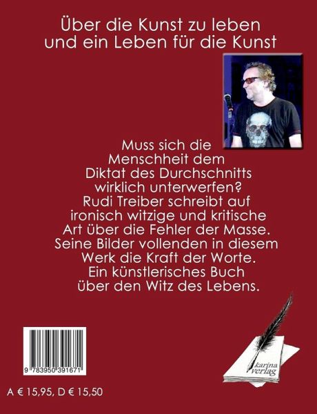 Rudi Treiber steht mit all seiner Kraft hinter seinen Vorha-ben, war Lehrer, ist Musiker, Maler, Olivenbauer und Schreiber - als Schriftsteller will er sich nicht bezeichnen - und dies alles mit einer Leidenschaft und Konsequenz, die viele verblüfft. Mit seinen Worten zeigt er die Fehler, Irrtümer und Irrglau-ben seiner Mitmenschen auf. Nimmt sich kein Blatt vor den Mund, um seine Meinung zu vertreten. Rudi Treiber versucht ein ehrlicher, gerechter Mensch zu sein und das zeigt er - vor allem in seinem künstlerischen Wirken. Ein Mann, der noch die wahre Bedeutung des Wortes "Mensch sein" lebt. Er ist ein "Lebemann" im positiven Sinn. Einer, der sich durch nichts und niemand von seinen Ideen abbringen lässt. Sich nicht dem Diktat der breiten Masse, dem Diktat des Durch-schnitts, unterwirft. Dieses Denken bringt er bereits in seinen Bildern sehr stark zum Ausdruck. Denn er malt, was er für gut findet, und nicht das, was die breite Masse sehen will. Seine Texte sind lebensnahe, bissig und ironisch, doch lei-der viel zu wahr, um spekulativ zu sein. Die Worte Treibers lassen niemanden kalt und erhitzen so manchen. Ein ständiger Provokateur, intellektueller Kosmopolit, Träu-mer und Illusionist. In seinen Worten, und in seiner Musik, teilt er seine Ansich-ten über Kindesmissbrauch, Drogen, Neonazis, Politik und Lügen der Menschheit. Aber er findet auch Platz für Sentimentales ohne Peinlichkeit. Manch einer wird sich angesprochen fühlen, manch einer vielleicht seine Ansichten verbessern, manch einer wohl beleidigt sein. Doch genau das will er mit diesem Buch erreichen. Die Menschen aufrütteln und sie aus dem Diktat des Durchschnitts reißen.