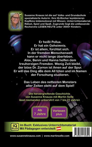 Er heißt Pollux.Er hat ein Geheimnis.Er ist allein, fürchtet sich.In der fremden Menschenweltkann er nicht lange überleben.Alex, Benni und Hanna helfen demtreuherzigen Fremden. Wenig Zeit bleibt,der böse Dr. Zorron ist ihnen auf der Spur.Er will das Ding aus dem All töten und im Namender Forschung studieren.Das Leben des nettesten Monstersaller Zeiten steht auf dem Spiel!Die herzergreifende Geschichte von Susanne Knauss mit Martin Selle lässt niemanden unberührt von 7 bis 77 Jahren.(Das Buch ist besonders auch zum Vorlesen geeignet. Es enthält Unterrichtsmaterial, einen spannenden Wissensteil, ein Malbuch ...).