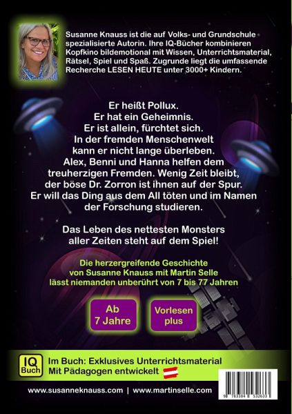 Er heißt Pollux.Er hat ein Geheimnis.Er ist allein, fürchtet sich.In der fremden Menschenweltkann er nicht lange überleben.Alex, Benni und Hanna helfen demtreuherzigen Fremden. Wenig Zeit bleibt,der böse Dr. Zorron ist ihnen auf der Spur.Er will das Ding aus dem All töten und im Namender Forschung studieren.Das Leben des nettesten Monstersaller Zeiten steht auf dem Spiel!Die herzergreifende Geschichte von Susanne Knauss mit Martin Selle lässt niemanden unberührt von 7 bis 77 Jahren.(Das Buch ist besonders auch zum Vorlesen geeignet. Es enthält Unterrichtsmaterial, einen spannenden Wissensteil, ein Malbuch ...).