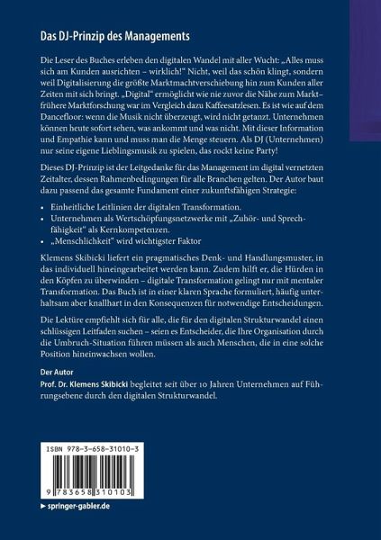 Die Leser des Buches erleben den digitalen Wandel mit aller Wucht: "Alles muss sich am Kunden ausrichten - wirklich!" Nicht, weil das schön klingt, sondern weil Digitalisierung die größte Marktmachtverschiebung hin zum Kunden aller Zeiten mit sich bringt. "Digital" ermöglicht wie nie zuvor die Nähe zum Markt- frühere Marktforschung war im Vergleich dazu Kaffeesatzlesen. Es ist wie auf dem Dancefloor: wenn die Musik nicht überzeugt, wird nicht getanzt. Unternehmen können heute sofort sehen, was ankommt und was nicht. Mit dieser Information und Empathie kann und muss man die Menge steuern. Als DJ (Unternehmen) nur seine eigene Lieblingsmusik zu spielen, das rockt keine Party!Dieses DJ-Prinzip ist der Leitgedanke für das Management im digital vernetzten Zeitalter, dessen Rahmenbedingungen für alle Branchen gelten. Der Autor baut dazu passend das gesamte Fundament einer zukunftsfähigen Strategie: Einheitliche Leitlinien der digitalen Transformation.Unternehmen als Wertschöpfungsnetzwerke mit "Zuhör- und Sprechfähigkeit" als Kernkompetenzen."Menschlichkeit" wird wichtigster FaktorKlemens Skibicki liefert ein pragmatisches Denk- und Handlungsmuster, in das individuell hineingearbeitet werden kann. Zudem hilft er die Hürden in den Köpfen zu überwinden - digitale Transformation gelingt nur mit mentaler Transformation. Das Buch ist in einer klaren Sprache formuliert, häufig unterhaltsam aber knallhart in den Konsequenzen für notwendige Entscheidungen.Die Lektüre empfiehlt sich für alle, die für den digitalen Strukturwandel einen schlüssigen Leitfaden suchen - seien es Entscheider, die Ihre Organisation durch die Umbruch-Situation führen müssen als auch Menschen, die in eine solche Position hineinwachsen wollen.