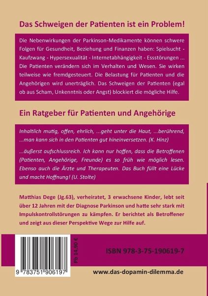 Das Dopamin Dilemma (Parkinson und Verhaltensstörungen):Die Nebenwirkungen der Parkinson-Medikamente können schwere Folgen für Gesundheit, Beziehung und Finanzen haben: Spielsucht - Kaufzwang - Hypersexualität - Internetabhängigkeit - Essstörungen - Hyperaktivität - Punding - Hobbyismus ... Die Patienten verändern sich im Verhalten und Wesen. Sie wirken teilweise wie fremdgesteuert. Die Belastung für Patienten und die Angehörigen wird unerträglich. Das Schweigen der Patienten - aus Scham, Unkenntnis oder Angst - verhindert eine wirkungsvolle Hilfe.Es ist das persönliche Erleben, das den Autor antreibt, einen Ratgeber für Betroffene zu schreiben.Denn was Matthias Dege an sich beobachtet, lässt ihn nicht ruhen. Er macht sich auf die Suche nach dem Grund für seine Verhaltensänderung.Ist es die Krankheit, das Idiopathische Parkinson Syndrom, das seine Persönlichkeit verändert? Sind es die Medikamente?Die überraschenden Ergebnisse zeigen eine völlig neue Sicht auf die Krankheit, die persönliche Situation, die Ursachen und die Verantwortlichkeiten. Auch anderen Patienten ergeht es ähnlich. Auch sie kämpfen mehr oder minder erfolglos gegen die unbezwingbaren Verhaltensänderungen an. Aus Unkenntnis oder Scham wird geschwiegen. Die Belastung steigt und dann zerbrechen final die Beziehungen.Doch Hilfe ist möglich! Deshalb hat der Matthias Dege seine Recherchen und Erfahrungen strukturiert zusammengestellt. Dieses Ratgeber ist das Ergebnis und zeigt den Betroffenen (Patienten und Angehörigen) Auswege auf.