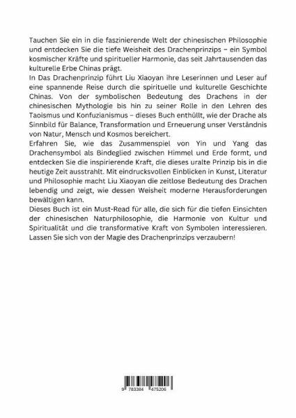 Tauchen Sie ein in die faszinierende Welt der chinesischen Philosophie und entdecken Sie die tiefe Weisheit des Drachenprinzips - ein Symbol kosmischer Kräfte und spiritueller Harmonie, das seit Jahrtausenden das kulturelle Erbe Chinas prägt.In Das Drachenprinzip führt Liu Xiaoyan ihre Leserinnen und Leser auf eine spannende Reise durch die spirituelle und kulturelle Geschichte Chinas. Von der symbolischen Bedeutung des Drachens in der chinesischen Mythologie bis hin zu seiner Rolle in den Lehren des Taoismus und Konfuzianismus - dieses Buch enthüllt, wie der Drache als Sinnbild für Balance, Transformation und Erneuerung unser Verständnis von Natur, Mensch und Kosmos bereichert.Erfahren Sie, wie das Zusammenspiel von Yin und Yang das Drachensymbol als Bindeglied zwischen Himmel und Erde formt, und entdecken Sie die inspirierende Kraft, die dieses uralte Prinzip bis in die heutige Zeit ausstrahlt. Mit eindrucksvollen Einblicken in Kunst, Literatur und Philosophie macht Liu Xiaoyandie zeitlose Bedeutung des Drachen lebendig und zeigt, wie dessen Weisheit moderne Herausforderungen bewältigen kann.Dieses Buch ist ein Must-Read für alle, die sich für die tiefen Einsichten der chinesischen Naturphilosophie, die Harmonie von Kultur und Spiritualität und die transformative Kraft von Symbolen interessieren. Lassen Sie sich von der Magie des Drachenprinzips verzaubern!