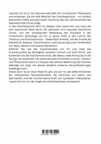 Tauchen Sie ein in die faszinierende Welt der chinesischen Philosophie und entdecken Sie die tiefe Weisheit des Drachenprinzips - ein Symbol kosmischer Kräfte und spiritueller Harmonie, das seit Jahrtausenden das kulturelle Erbe Chinas prägt.In Das Drachenprinzip führt Liu Xiaoyan ihre Leserinnen und Leser auf eine spannende Reise durch die spirituelle und kulturelle Geschichte Chinas. Von der symbolischen Bedeutung des Drachens in der chinesischen Mythologie bis hin zu seiner Rolle in den Lehren des Taoismus und Konfuzianismus - dieses Buch enthüllt, wie der Drache als Sinnbild für Balance, Transformation und Erneuerung unser Verständnis von Natur, Mensch und Kosmos bereichert.Erfahren Sie, wie das Zusammenspiel von Yin und Yang das Drachensymbol als Bindeglied zwischen Himmel und Erde formt, und entdecken Sie die inspirierende Kraft, die dieses uralte Prinzip bis in die heutige Zeit ausstrahlt. Mit eindrucksvollen Einblicken in Kunst, Literatur und Philosophie macht Liu Xiaoyandie zeitlose Bedeutung des Drachen lebendig und zeigt, wie dessen Weisheit moderne Herausforderungen bewältigen kann.Dieses Buch ist ein Must-Read für alle, die sich für die tiefen Einsichten der chinesischen Naturphilosophie, die Harmonie von Kultur und Spiritualität und die transformative Kraft von Symbolen interessieren. Lassen Sie sich von der Magie des Drachenprinzips verzaubern!