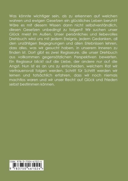 Was könnte wichtiger sein, als zu erkennen auf welchen wahren und ewigen Gesetzen ein glückliches Leben beruht? Wäre es mit diesem Wissen dann nicht selbstverständlich, diesen Gesetzen unbedingt zu folgen? Wir suchen unser Glück meist im Außen. Unser persönliches und liebevolles Drehbuch wird uns mit jedem Ereignis, jedem Gedanken, all den unzähligen Begegnungen und allen Erlebnissen lehren, dass alles, was wir gesucht haben, in unserem Inneren zu finden ist. Dort gibt es zwei Regisseure, die unser Drehbuch aus vollkommen gegensätzlichen Perspektiven bewerten. Ein Regisseur blickt auf die Liebe, der andere nur auf die Angst. Nun ist es an uns zu entscheiden, welchem Rat wir vertrauensvoll folgen werden. Schritt für Schritt werden wir lernen und tatsächlich erfahren, dass wir noch niemals machtlos waren und wir unser Recht auf Glück und Frieden selbst bestimmen können.
