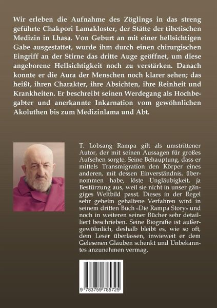 Wir erleben die Aufnahme des Zöglings in das streng geführte Chakpori Lamakloster, der Stätte der tibetischen Medizin in Lhasa. Von Geburt an mit einer hellsichtigen Gabe ausgestattet, wurde ihm durch einen chirurgischen Eingriff an der Stirne das dritte Auge geöffnet, um diese angeborene Hellsichtigkeit noch zu verstärken. Danach konnte er die Aura der Menschen noch klarer sehen; das heisst, ihren Charakter, ihre Absichten, ihre Reinheit und Krankheiten. Er beschreibt seinen Werdegang als Hochbegabter und anerkannte Inkarnation vom gewöhnlichen Akoluthen bis zum Medizinlama und Abt.