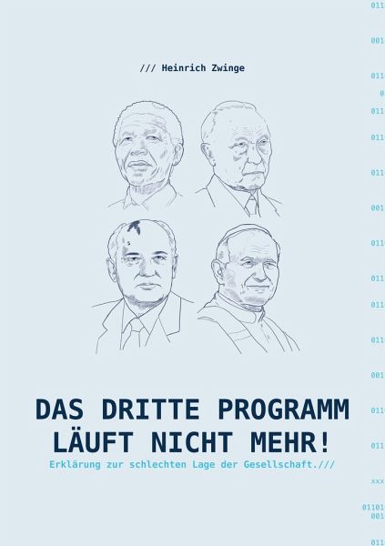 Das Buch ist nach fast zwanzig Jahren fertig und enthält die Gedanken und Erklärungen des Schlossermeisters Heinrich Zwinge über die Welt. Er nimmt die Welt in einem schlechten Zustand wahr und sucht nach Erklärungen. Zentral ist der Gedanke des "Erwachsen werden" oder besser des "Nicht Erwachsen Werden". Um Erwachsen zu werden, benötigt die Menschheit drei Programme. Die ersten beiden Programme sind Natur gegeben. Das sind Wachstum des Körpers und Lernen bis zum Tode sind naturgegeben. Entscheidend ist das Erwachsen werden im Geiste und Verstand, das "Dritte Programm". Jedoch haben die meisten Menschen das "Dritte Programm" nicht eingeschaltet. Die Unfähigkeit das "Dritte Programm" zu nutzen, welche durch alle wesentlichen Bereiche der Gesellschaft geht, erklärt und beschreibt Heinrich Zwinge in seinem Buch. Im Zentrum der Zukunft sieht er die Kinder, die aber nicht erzogen, sondern betreut werden sollten, damit sie dann das "Dritte Programm" nutzen und sich die Menschheit endlich zu dem entwickelt, was möglich, gerecht und notwendig ist, damit die Erde überlebt.