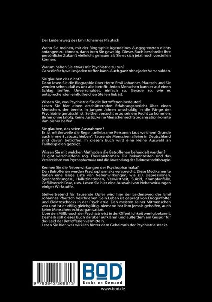 Der Leidensweg des Emil Johannes PfautschWenn Sie meinen, mit der Biographie irgendeines Ausgegrenzten nichts anfangen zu können, dann irren Sie gewaltig. Dieses Buch beschreibt Ihre persönliche Zukunft vielleicht genauer als Sie es sich jetzt noch vorstellen können.Warum haben Sie etwas mit Psychiatrie zu tun?Ganz einfach, weil es jeden treffen kann. Auch ganz ohne jedes Verschulden.Sie glauben das nicht?Dann lesen Sie die Biographie über Herrn Emil Johannes Pfautsch und Sie werden sehen, daß es uns alle betrifft. Jeden Menschen kann es auf einen Schlag treffen. Unverschuldet, einfach so. Gerade so, wie es entsprechenden einflußreichen Stellen lieb ist.Wissen Sie, was Psychiatrie für die Betroffenen bedeutet?Lesen Sie hier einen erschütternden Erfahrungsbericht über einen Menschen, der bereits in jungen Jahren unschuldig in die Fänge der Psychiatrie gerutscht ist. Seither versucht er zu seinem Recht zu kommen. Bisher ohne Erfolg. Keine Justiz, keine Menschenrechtsorganisation konnte ihm bisher helfen.Sie glauben, das seien Ausnahmen?Es ist mittlerweile die Regel, unliebsame Personen (aus welchem Grunde auch immer) "abzuschieben". Tausende Menschen alleine in Deutschland sind davon betroffen. In diesem Buch wird eine kleine Auswahl an Fallbeispielen gezeigt.Wissen Sie mit welchen Methoden die Betroffenen behandelt werden?Es gibt verschiedene sog. Therapieformen. Die bekanntesten sind das Verabreichen von Psychopharmaka und die Anwendung der Elektroschocktherapie.Kennen Sie die Nebenwirkungen der Psychopharmaka?Den Betroffenen werden Psychopharmaka verabreicht. Diese Medikamente haben eine lange Liste von Nebenwirkungen, wie z.B. Depressionen, Sprechstörungen., Halluzinationen, Verwirrtheit, Suizid, Krampfanfälle, Gefäßverschlüsse, usw. Lesen Sie hier eine Auswahl von Nebenwirkungen einiger Wirkstoffe.Stellvertretend für Tausende Opfer wird hier der Leidensweg des Emil Johannes Pfautsch beschrieben. Sein Leben ist geprägt von Drogenfolter und Elektroschocks in der Psychiatrie. Den meisten seiner Mitmenschen war und ist er völlig gleichgültig, niemand hat ihm jemals geholfen, auch keine Menschenrechtsorganisation.Über den Mißbrauch der Psychiatrie ist in der Öffentlichkeit wenig bekannt. Deshalb soll dieses Buch darüber aufklären und außerdem ein Gespür für das Leid der Betroffenen vermitteln.Lesen Sie hier, was wirklich hinter dem Geheimnis der Psychiatrie steckt.
