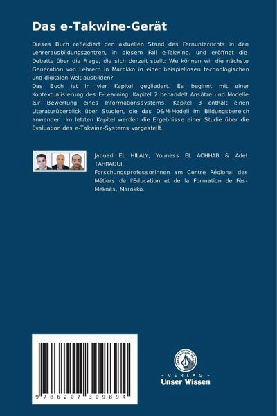 Dieses Buch reflektiert den aktuellen Stand des Fernunterrichts in den Lehrerausbildungszentren, in diesem Fall e-Takwine, und eröffnet die Debatte über die Frage, die sich derzeit stellt: Wie können wir die nächste Generation von Lehrern in Marokko in einer beispiellosen technologischen und digitalen Welt ausbilden?Das Buch ist in vier Kapitel gegliedert. Es beginnt mit einer Kontextualisierung des E-Learning. Kapitel 2 behandelt Ansätze und Modelle zur Bewertung eines Informationssystems. Kapitel 3 enthält einen Literaturüberblick über Studien, die das D&M-Modell im Bildungsbereich anwenden. Im letzten Kapitel werden die Ergebnisse einer Studie über die Evaluation des e-Takwine-Systems vorgestellt.