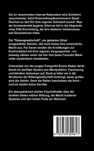 Als im verschneiten Internat Rabenstein eine Schülerin verschwindet, kehrt Kriminalhauptkommissarin Sarah Reichert an den Ort ihrer eigenen Schulzeit zurück. Was als Vermisstenfall beginnt, führt sie tief in die Abgründe einer Elite-Einrichtung, die ihre düsteren Geheimnisse seit Generationen hütet. Die "Rabengesellschaft", ein geheimer Zirkel ausgewählter Schüler, übt noch immer ihre unheimliche Macht aus. Für Sarah werden die Ermittlungen zur Konfrontation mit ihrer eigenen Vergangenheit - vor zwanzig Jahren verlor sie hier ihre beste Freundin Marie unter mysteriösen Umständen. Unterstützt von der jungen Fotografin Emma Weber deckt Sarah ein perfides System aus Manipulation, Erpressung und blindem Gehorsam auf. Doch je tiefer sie in die Strukturen der Rabengesellschaft eindringt, desto grösser wird die Gefahr. Denn die Raben beschützen die Ihren - und sie dulden keine Verräter. Ein atmosphärisch dichter Psychothriller über die dunklen Seiten elitärer Bildung, die Macht tradierter Systeme und den hohen Preis der Wahrheit.