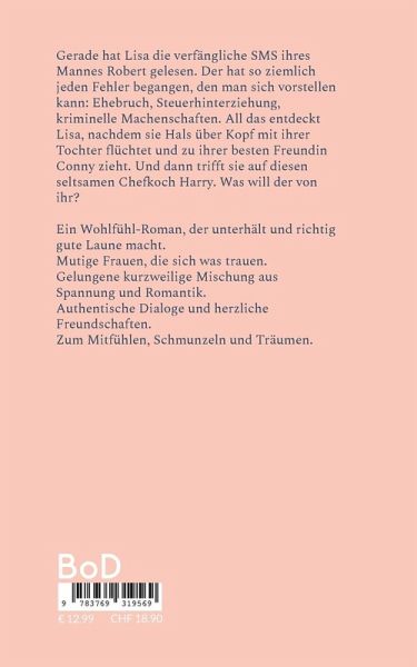 Gerade hat Lisa die verfängliche SMS ihres Mannes Robert gelesen. Der hat so ziemlich jeden Fehler begangen, den man sich vorstellen kann: Ehebruch, Steuerhinterziehung, kriminelle Machenschaften. All das entdeckt Lisa, nachdem sie Hals über Kopf mit ihrer Tochter flüchtet und zu ihrer besten Freundin Conny zieht. Und dann trifft sie auf diesen seltsamen Chefkoch Harry. Was will der von ihr? Ein Wohlfühl-Roman, der unterhält und richtig gute Laune macht. Mutige Frauen, die sich was trauen. Gelungene kurzweilige Mischung aus Spannung und Romantik. Authentische Dialoge und herzliche Freundschaften. Zum Mitfühlen, Schmunzeln und Träumen.