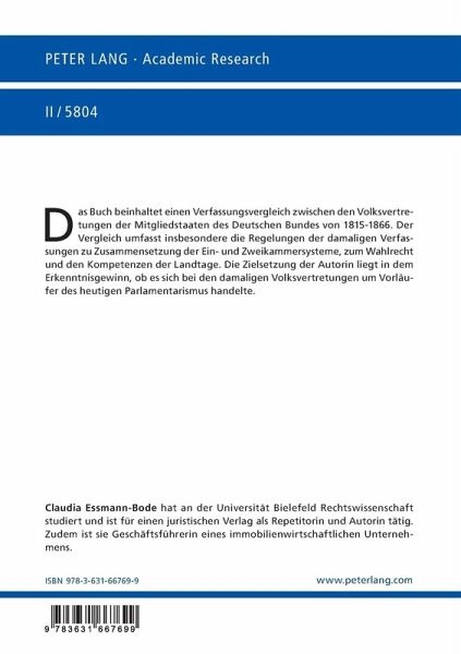 Das Buch beinhaltet einen Verfassungsvergleich zwischen den Volksvertretungen der Mitgliedstaaten des Deutschen Bundes von 1815-1866. Der Vergleich umfasst insbesondere die Regelungen der damaligen Verfassungen zu Zusammensetzung der Ein- und Zweikammersysteme, zum Wahlrecht und den Kompetenzen der Landtage. Die Zielsetzung der Autorin liegt in dem Erkenntnisgewinn, ob es sich bei den damaligen Volksvertretungen um Vorläufer des heutigen Parlamentarismus handelte.