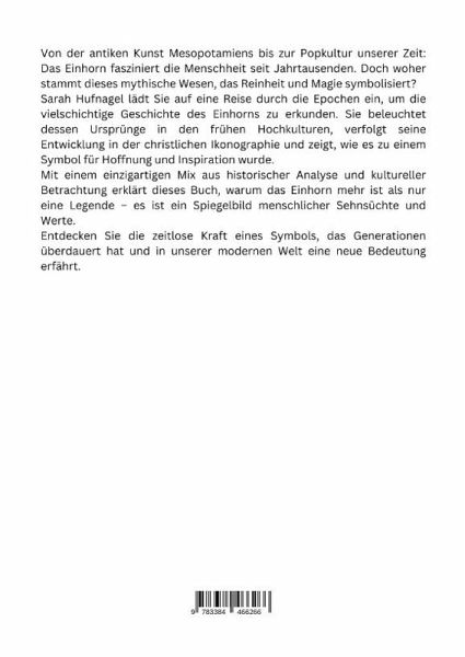 Von der antiken Kunst Mesopotamiens bis zur Popkultur unserer Zeit: Das Einhorn fasziniert die Menschheit seit Jahrtausenden. Doch woher stammt dieses mythische Wesen, das Reinheit und Magie symbolisiert?Sarah Hufnagel lädt Sie auf eine Reise durch die Epochen ein, um die vielschichtige Geschichte des Einhorns zu erkunden. Sie beleuchtet dessen Ursprünge in den frühen Hochkulturen, verfolgt seine Entwicklung in der christlichen Ikonographie und zeigt, wie es zu einem Symbol für Hoffnung und Inspiration wurde.Mit einem einzigartigen Mix aus historischer Analyse und kultureller Betrachtung erklärt dieses Buch, warum das Einhorn mehr ist als nur eine Legende - es ist ein Spiegelbild menschlicher Sehnsüchte und Werte.Entdecken Sie die zeitlose Kraft eines Symbols, das Generationen überdauert hat und in unserer modernen Welt eine neue Bedeutung erfährt.