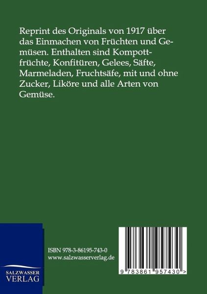 Reprint des Originals von 1917 über das Einmachen von Früchten und Gemüsen. Enthalten sind Kompottfrüchte, Konfitüren, Gelees, Säfte, Marmeladen, Fruchtsäfe, mit und ohne Zucker, Liköre und alle Arten von Gemüse.