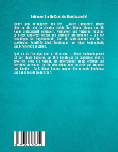 Dieser erste Teil des großen Einmaleins der Nagelkosmetik ist für alle gedacht, die ihre Hände und Nägel privat pflegen, verlängern und gestalten möchten. Herausgelöst aus dem Gesamtwerk bietet dieses Buch fundiertes Wissen zu Nagelanatomie, Materialkunde und einfachen Techniken, ohne gewerbliche Absichten zu verfolgen. Perfekt für den Eigengebrauch und für alle, die professionelle Ergebnisse zu Hause erzielen möchten.
