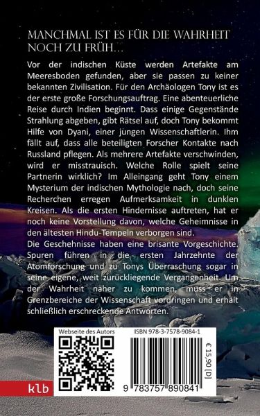 MANCHMAL IST ES FÜR DIE WAHRHEIT NOCH ZU FRÜH...Vor der indischen Küste werden Artefakte am Meeresboden gefunden, aber sie passen zu keiner bekannten Zivilisation. Für den Archäologen Tony ist es der erste große Forschungsauftrag. Eine abenteuerliche Reise durch Indien beginnt. Dass einige Gegenstände Strahlung abgeben, gibt Rätsel auf, doch Tony bekommt Hilfe von Dyani, einer jungen Wissenschaftlerin. Ihm fällt auf, dass alle beteiligten Forscher Kontakte nach Russland pflegen. Als mehrere Artefakte verschwinden, wird er misstrauisch. Welche Rolle spielt seine Partnerin wirklich? Im Alleingang geht Tony einem Mysterium der indischen Mythologie nach, doch seine Recherchen erregen Aufmerksamkeit in dunklen Kreisen. Als die ersten Hindernisse auftreten, hat er noch keine Vorstellung davon, welche Geheimnisse in den ältesten Hindu-Tempeln verborgen sind. Die Geschehnisse haben eine brisante Vorgeschichte. Spuren führen in die ersten Jahrzehnte der Atomforschung und zu Tonys Überraschung sogar in seine eigene, weit zurückliegende Vergangenheit. Um der Wahrheit näher zu kommen, muss er in Grenzbereiche der Wissenschaft vordringen und erhält schließlich erschreckende Antworten.+++++ Enthält Bonusmaterial: - Glossar mit Begriffserklärungen und Abbildungen (im E-Book Direktsprung aus dem Text möglich), - Im Nachwort wird Realität und Fiktion gegenübergestellt, mit einigen Überraschungen.