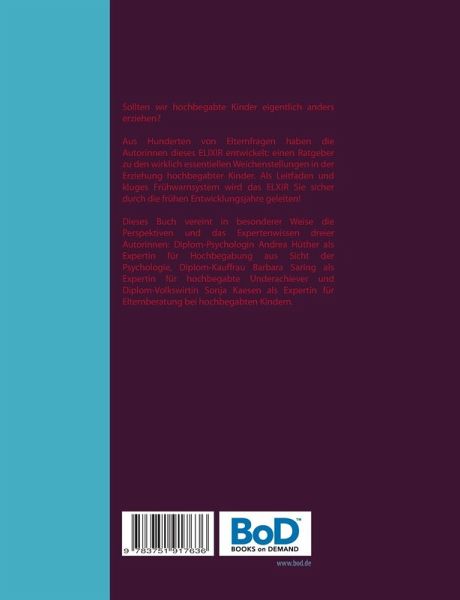 Sollten wir hochbegabte Kinder eigentlich anders erziehen? Im Laufe ihrer langjährigen Beratungstätigkeit sind den Autorinnen Hunderte von Elternfragen rund um das Thema Hochbegabung begegnet. Daraus wurde dieser besondere Ratgeber entwickelt: Ein ELIXIR der wirklich essentiellen Weichenstellungen in der Erziehung hochbegabter Kinder. Als Leitfaden und kluges Frühwarnsystem wird es Sie sicher durch die frühen Entwicklungsjahre geleiten!"Warum zeigt mein Kind trotz hoher Begabung schlechte Schulleistungen?" Eltern mit Kindern in einer solchen, als Underachievement bezeichneten Situation suchen oft leider erst sehr spät eine Beratung auf. Wer hingegen schon früh wichtige Informationen erhält, kann sein Kind bewusster begleiten, seine ganzheitliche Entwicklung fördern und einer möglichen schulischen Minderleistung gut vorbauen. Auch zu anderen Fragestellungen wie soziale Integration, Motorik oder intellektuelle und emotionale Förderung hält der Ratgeber vorbeugende Tipps bereit, um Probleme gar nicht erst entstehen zu lassen. Das ELIXIR vereint in besonderer Weise die Perspektiven und das Expertenwissen dreier Autorinnen: Diplom-Psychologin Andrea Hüther als Expertin für Hochbegabung aus Sicht der Psychologie, Diplom-Kauffrau Barbara Saring als Expertin für hochbegabte Underachiever und Diplom-Volkswirtin Sonja Kaesen als Expertin für Elternberatung bei hochbegabten Kindern. Nehmen Sie dieses Buch ruhig öfters zur Hand - immer dann, wenn neue Erziehungsfragen auftauchen. Für Eltern, die wenig Zeit haben, bietet dieser Ratgeber eine schnelle, wichtige Orientierung.