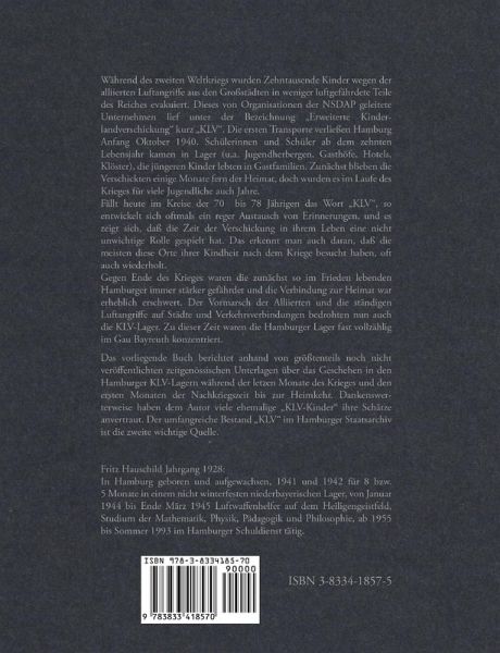 Während des zweiten Weltkriegs wurden Zehntausende Kinder wegen der alliierten Luftangriffe aus den Großstädten in weniger luftgefährdete Teile des Reiches evakuiert. Dieses von Organisationen der NSDAP geleitete Unternehmen lief unter der Bezeichnung "Erweiterte Kinderlandverschickung" kurz "KLV". Die ersten Transporte verließen Hamburg Anfang Oktober 1940. Schülerinnen und Schüler ab dem zehnten Lebensjahr kamen in Lager (u.a. Jugendherbergen, Gasthöfe, Hotels, Klöster), die jüngeren Kinder lebten in Gastfamilien. Zunächst blieben die Verschickten einige Monate fern der Heimat, doch wurden es im Laufe des Krieges für viele Jugendliche auch Jahre. Fällt heute im Kreise der 70- bis 78-Jährigen das Wort "KLV", so entwickelt sich oftmals ein reger Austausch von Erinnerungen, und es zeigt sich, daß die Zeit der Verschickung in ihrem Leben eine nicht unwichtige Rolle gespielt hat. Das erkennt man auch daran, daß die meisten diese Orte ihrer Kindheit nach dem Kriege besucht haben, oft auch wiederholt. Gegen Ende des Krieges waren die zunächst so im Frieden lebenden Hamburger immer stärker gefährdet und die Verbindung zur Heimat war erheblich erschwert. Der Vormarsch der Alliierten und die ständigen Luftangriffe auf Städte und Verkehrsverbindungen bedrohten nun auch die KLV-Lager. Zu dieser Zeit waren die Hamburger Lager fast vollzählig im Gau Bayreuth konzentriert. Das vorliegende Buch berichtet anhand von größtenteils noch nicht veröffentlichten zeitgenössischen Unterlagen über das Geschehen in den Hamburger KLV-Lagern während der letzen Monate des Krieges und den ersten Monaten der Nachkriegszeit bis zur Heimkehr. Dankenswerterweise haben dem Autor viele ehemalige "KLV-Kinder" ihre Schätze anvertraut. Der umfangreiche Bestand "KLV" im Hamburger Staatsarchiv ist die zweite wichtige Quelle.