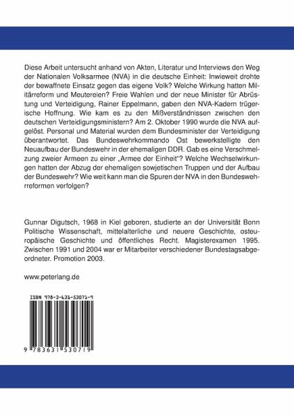 Diese Arbeit untersucht anhand von Akten, Literatur und Interviews den Weg der Nationalen Volksarmee (NVA) in die deutsche Einheit: Inwieweit drohte der bewaffnete Einsatz gegen das eigene Volk? Welche Wirkung hatten Militärreform und Meutereien? Freie Wahlen und der neue Minister für Abrüstung und Verteidigung, Rainer Eppelmann, gaben den NVA-Kadern trügerische Hoffnung. Wie kam es zu den Mißverständnissen zwischen den deutschen Verteidigungsministern? Am 2. Oktober 1990 wurde die NVA aufgelöst. Personal und Material wurden dem Bundesminister der Verteidigung überantwortet. Das Bundeswehrkommando Ost bewerkstelligte den Neuaufbau der Bundeswehr in der ehemaligen DDR. Gab es eine Verschmelzung zweier Armeen zu einer "Armee der Einheit"? Welche Wechselwirkungen hatten der Abzug der ehemaligen sowjetischen Truppen und der Aufbau der Bundeswehr? Wie weit kann man die Spuren der NVA in den Bundeswehrreformen verfolgen?