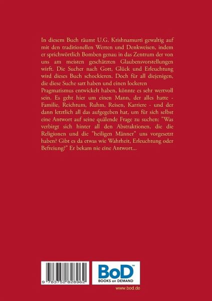 In diesem Buch räumt U.G. Krishnamurti gewaltig auf mit den traditionellen Werten und Denkweisen, indem er sprichwörtlich Bomben genau in das Zentrum der von uns am meistengeschätzten Glaubensvorstellungen wirft. Die Sucher nach Gott, Glück und Erleuchtung wird dieses Buch schockieren. Doch für all diejenigen, die diese Suche satt haben und einen lockeren Pragmatismus entwickelt haben, könnte es sehr wertvoll sein. Es geht hier um einen Mann, der alles hatte - Familie, Reichtum, Ruhm, Reisen, Karriere - und der dann letztlich all das aufgegeben hat, um für sich selbst eine Antwort auf seine quälende Frage zu suchen: "Was verbirgt sich hinter all den Abstraktionen, die die Religionen und die "heiligen Männer" uns vorgesetzt haben? Gibt es da etwas wie Wahrheit, Erleuchtung oder Befreiung?" Er bekam nie eine Antwort...
