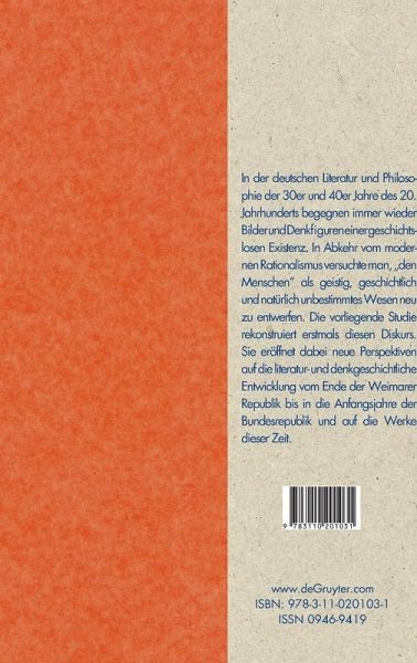 In der deutschen Literatur und Philosophie vom Ende der zwanziger bis in die fünfziger Jahre des 20. Jahrhunderts begegnen immer wieder Bilder und Denkfiguren einer geschichtslosen Existenz. In Abkehr vom modernen Rationalismus, Humanismus und Vitalismus versucht man, "den Menschen" als geistig, geschichtlich und natürlich unbestimmtes Wesen neu zu entwerfen. Dabei wird die in der Weimarer Republik breit diskutierte Kultur- und Wissenskrise nun als Krise des neuzeitlichen Vernunft- und Geschichtsglaubens, ja als Ende des homininen Zeitalters gedeutet. Die vorliegende Studie rekonstruiert erstmals fallstudienartig die Entstehung und Wandlung dieses existenzial-anthropologischen Diskurses. Sie eröffnet dabei zum einen einen neuen Blick auf die literatur- und denkgeschichtlichen Verbindungen zwischen dem Ende der Weimarer Republik und den Anfangsjahren der Bundesrepublik. Zum anderen entwickelt sie einen neuen, wissensgeschichtlichen Interpretationszugang zu Texten bekannter undwenig bekannter Autoren dieser Zeit, darunter Gottfried Benn, Otto Friedrich Bollnow, Arnold Gehlen, Ernst Jünger, Horst Lange, Gerhard Nebel und Egon Vietta.