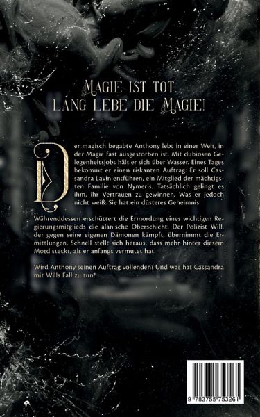 Magie ist tot, lang lebe die MagieDer magisch begabte Anthony lebt in einer Welt, in der Magie fast ausgestorben ist. Mit dubiosen Gelegenheitsjobs hält er sich über Wasser. Eines Tages bekommt er einen riskanten Auftrag: Er soll Cassandra Lavin entführen, ein Mitglied der mächtigsten Familie von Nymeris. Tatsächlich gelingt es ihm, ihr Vertrauen zu gewinnen. Was er jedoch nicht weiß: Sie hat ein düsteres Geheimnis.Währenddessen erschüttert die Ermordung eines wichtigen Regierungsmitglieds die alanische Oberschicht. Der Polizist Will, der gegen seine eigenen Dämonen kämpft, übernimmt die Ermittlungen. Schnell stellt sich heraus, dass mehr hinter diesem Mord steckt, als er anfangs vermutet hat.Wird Anthony seinen Auftrag vollenden? Und was hat Cassandra mit Wills Fall zu tun?Leseprobe»Tony.« Er lächelte. »Ich bin Cedric Mallori.«Ein kloßartiges Gefühl breitete sich in Anthonys Hals aus.Das war also Cassies Vater. Der Wissenschaftler. Er war jünger, als Anthony ihn sich vorgestellthatte.»Sag mir, Tony, wie kommt es, dass du auf so einem exklusiven Fest bist?«Ich möchte deine Tochter unter Drogen setzen und anschließend entführen, aber das kann ich dir schlecht sagen.»Zufall. Ich war auch überrascht, als ich die Einladung erhalten habe«, murmelte Anthony und suchte fieberhaft nach einem Ausweg aus diesem Gespräch.Cedric Mallori legte den Kopf schief. »Ich glaube, ich weiß, wer du bist.«Leserstimmen"Das Setting ist wie das Cover düster gehalten und man spürt direkt das finstere Flair, welches einen von Seite zu Seite immer entgegen zu springen scheint. Allerdings schafft es die Autorin durch humorvolle/spritzige Dialoge dem Ganzen ein wenig Witz abzugewinnen, sodass während des Lesens das ein oder andere Schmunzeln über meine Lippen huschte."-- jessica rothbauer"Ein toller erster Teil, der mich überzeugen konnte. Ganz besonders haben es mir die wunderbaren vielseitigen Charaktere angetan, die die Geschichte lebendig gemacht haben. Fantasy mit Charme, Spannung und Emotionen. Ich freue mich jetzt schon wahnsinnig auf den nächsten Teil dieser tollen Geschichte."- renas bücherleidenschaftEntdecke die neue Dark-Fantasy-ReiheDer Auftakt der Dark-Fantasy-Reihe entführt dich in eine moderne Fantasywelt, die an das 20. Jahrhundert angelehnt ist. Dich erwarten spannende Intrigen, facettenreiche Charaktere und düstere Geheimnisse.