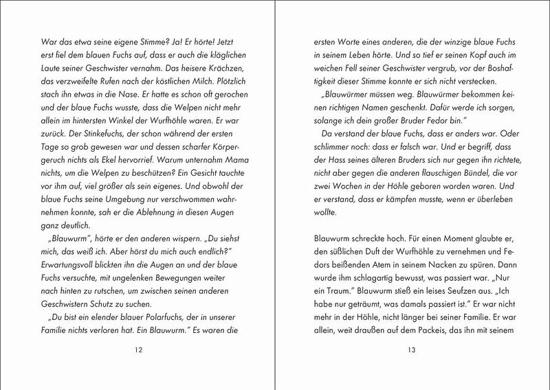 Blauwurm nennen die Geschwister den Polarfuchs, der als einziger von ihnen im Winter kein schneeweißes Fell bekommen wird. Sie lassen ihn glauben, dass er weniger wert sei. Voller Entschlossenheit verlässt der blaue Fuchs seine Familie und läuft los. Auf seiner Reise über das zugefrorene Polarmeer erhält er von einer Eisbärin den Namen Grischa, der Wachsame. Bald schon erwartet er mit seiner Partnerin Junge. Doch zwischen den blauen Welpen tummelt sich auch eine weiße Füchsin. Grischa nimmt sich vor, ihr niemals das Gefühl zu geben, anders zu sein. Kann ihm das gelingen?