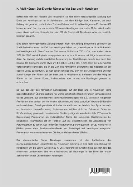 Betrachtet man die Historie von Neudingen, so fällt seine herausragende Stellung zum Ende der Karolingerzeit im 9. Jahrhundert mit dem Königs- bzw. Kaiserhof, oft auch Kaiserpfalz genannt, und mit dem Tod des Kaisers Karl III. in Neudingen am 13. Januar 888 besonders auf. Kurz vorher im Jahr 870 wurde Neudingen zum ersten Mal erwähnt und in einer etwas späteren Urkunde im Jahr 881 als Grafschaft Neudingen oder "in comitatu Nidinga" genannt.Eine derart hervorgehobene Stellung entsteht nicht rein zufällig, sondern sie beruht oft auf Vorläuferinstitutionen. Im Fall von Neudingen liefert das "merowingerzeitliche Gräberfeld bei Neudingen auf Löbern" aus der Zeit von ca. 510 bis ca. 730 n. Chr., das in den Jahren 1978 bis 1990 archäologisch ausge-graben und erforscht wurde, wichtige Informationen dazu. Der Umfang und die qualitative Ausstattung der Bestattungen bereits kurz nach dem Beginn des Alemannentums etwa um die Jahre 400 bis 500 n. Chr. lässt auf eine weitere Vorgeschichte schließen, die in die Zeit des römischen Besitztums des Gebietes an der oberen Donau zurückführt. Es war daher naheliegend, sich mit der Anwesenheit und den Auswirkungen der Römer auf der Baar und in Neudingen zu befassen und den Weg der Römer an der oberen Donau, insbesondere aber in und um Neudingen genauer zu erforschen.Da aus der Zeit des römischen Landbesitzes auf der Baar und in Neudingen keine gegenständlichen Überbleibsel und nur wenig schriftliche Überlieferungen vorhanden sind, wurde versucht, aus verbliebenen Namensüberlieferungen wie z.B. lateinisch klingenden Flurnamen, den Verlauf der historisch bekannten "via iuxta danuvium" (Donau-Südstraße) nachzuzeichnen. Dabei gestaltete sich das Herausfinden der lateinischen Sprachwurzeln als besondere Herausforderung. Insbesondere reihten sich der Ortsname Behla am Straßenanfang genauso in das römische Straßengefüge ein wie die im Jahr 772 genannte Bezeichnung Paumcartun als mutmaßlicher Name der römischen Straßenstation bei Neudingen. Paumcartun ist im Hinblick auf die Straßenmeilen als Abänderung von Parumquartum zu sehen, was in der Übersetzung von "parum quartum" als "zu kleine vierte" (Meile) genau dem Straßenmeilen-Punkt am Pfalzhügel bei Neudingen entspricht. Paumcartun war demnach also am Ort der "zu kleinen vierten" (Meile).Der alemannische Name Neudingen zusammen mit der Aufdeckung des merowingerzeitlichen Gräberfeldes bei Neudingen bekräftigen eine erste Besiedelung von Neudingen um die Jahre 400 bis 500 n. Chr., während die Erkenntnisse aus der Zeit des römischen Landbesitzes eine erste Ansiedlung bei Neudingen in der Mitte des ersten Jahrhunderts nach Christi Geburt nahelegen.