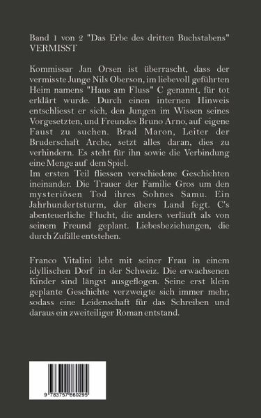 Band 1 von 2 "Das Erbe des dritten Buchstabens" VERMISSTKommissar Jan Orsen ist überrascht, dass der vermisste Junge Nils Oberson, im liebevoll geführten Heim namens "Haus am Fluss" C genannt, für tot erklärt wurde. Durch einen internen Hinweis entschliesst er sich, den Jungen im Wissen seines Vorgesetzten, und Freundes Bruno Arno, auf eigene Faust zu suchen. Brad Maron, Leiter der Bruderschaft Arche, setzt alles daran, dies zu verhindern. Es steht für ihn sowie die Verbindung eine Menge auf dem Spiel. Im ersten Teil fliessen verschiedene Geschichten ineinander. Die Trauer der Familie Gros um den mysteriösen Tod ihres Sohnes Samu. Ein Jahrhundertsturm, der übers Land fegt. C's abenteuerliche Flucht, die anders verläuft als von seinem Freund geplant. Liebesbeziehungen, die durch Zufälle entstehen.