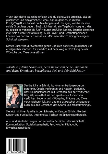 Wenn sich deine Wünsche erfüllen und du deine Ziele erreichst, bist du glücklicher und erfolgreicher. Genau darum geht es. In diesem ErfolgsTageBuch findest du Anleitungen und Übungen, welche dir eine solide Grundlage geben. Zusätzlich hast du ein Tagebuch integriert, das du täglich in weniger als fünf Minuten ausfüllen kannst. Sportler erreichen ihre Ziele durch Mentaltraining. Auch Privat- und Geschäftspersonen können das nutzen. Ich nenne es: «Mit mentalem Training das eigene Schicksal steuern».Dieses Buch wird dir Sicherheit geben und dich positiver, glücklicher und erfolgreicher machen. Es wird dich auf dem Weg zur Erfüllung deiner Wünsche und Ziele unterstützen. Im Teil 1 findest du die Grundlagen und hilfreiche Tipps für den Alltag. Im Teil 2 findest du Übungen und Anleitungen mit Platz für deine Notizen. Im Teil 3 findest du das Tagebuch für 365 Tage. Im Teil 4 erhältst du zusätzliche Inspiration. «Achte auf deine Gedanken, denn sie steuern deine Emotionen und deine Emotionen beeinflussen dich und dein Schicksal.»
