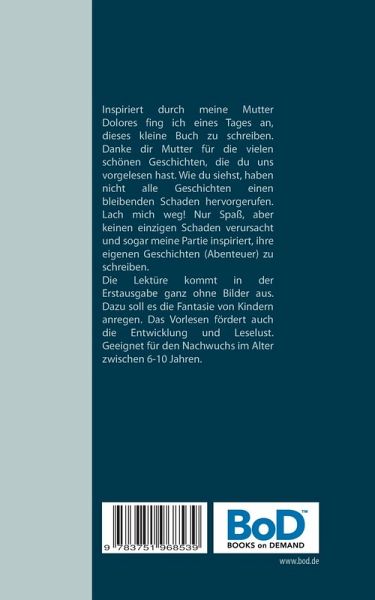 Inspiriert durch meine Mutter, Dolores, begann ich eines Tages, dieses kleine Buch zu verfassen. Ich danke dir, Mutter, für die vielen interessanten Geschichten, die du uns vorgelesen hast! Nicht alle Geschichten haben einen Schaden angerichtet. Die Lektüre ist in der Erstausgabe ohne Bilder ausführbar. Dazu soll es die Fantasie von Kindern anregen. Das Vorlesen fördert auch die Entwicklung und Leselust. Geeignet für den Nachwuchs im Alter zwischen 6 und 10 Jahren.