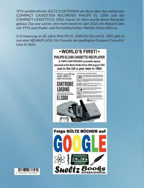 !976 veröffentlichte ein Abzweig von SÜLTZ ELEKTRONIK, zukünftig SÜLTZ BÜCHER, ein Buch über den weltersten COMPACT CASSETTEN RECORDER PHILIPS EL 3300 und der COMPACT CASSETTE EL 1903. Ganze 16 Jahre wurde dieser Recorder gebaut. Das war und ist, erst recht heute im Jahr 2023, ein Rekord! Dies sah 1976 auch Radio- und Fernsehtechniker-Meister Heinz Sültz so. In Erinnerung an 60 Jahre PHILIPS EL 3300/01/02 und EL 1903 gibt es nun eine NEUAUFLAGE. Für Freunde der gepflegten Compact Cassette! Uwe H. Sültz