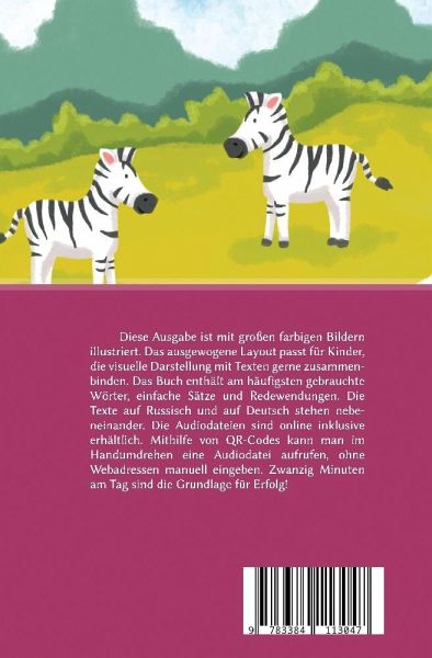 Diese Ausgabe ist mit großen farbigen Bildern illustriert. Das ausgewogene Layout passt für Kinder, die visuelle Darstellung mit Texten gerne zusammenbinden. Das Buch enthält am häufigsten gebrauchte Wörter, einfache Sätze und Redewendungen. Die Texte auf Russisch und auf Deutsch stehen nebeneinander. Die Audiodateien sind online inklusive erhältlich. Mithilfe von QR-Codes kann man im Handumdrehen eine Audiodatei aufrufen, ohne Webadressen manuell eingeben. Zwanzig Minuten am Tag sind die Grundlage für Erfolg!