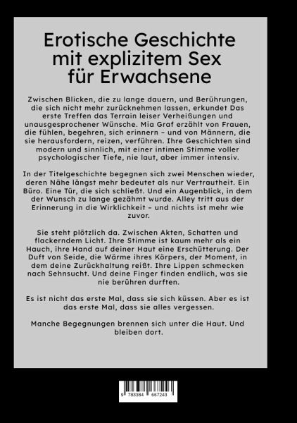 Zwischen Blicken, die zu lange dauern, und Berührungen, die sich nicht mehr zurücknehmen lassen, erkundet Das erste Treffen das Terrain leiser Verheißungen und unausgesprochener Wünsche. Mia Graf erzählt von Frauen, die fühlen, begehren, sich erinnern - und von Männern, die sie herausfordern, reizen, verführen. Ihre Geschichten sind modern und sinnlich, mit einer intimen Stimme voller psychologischer Tiefe, nie laut, aber immer intensiv.In der Titelgeschichte begegnen sich zwei Menschen wieder, deren Nähe längst mehr bedeutet als nur Vertrautheit. Ein Büro. Eine Tür, die sich schließt. Und ein Augenblick, in dem der Wunsch zu lange gezähmt wurde. Alley tritt aus der Erinnerung in die Wirklichkeit - und nichts ist mehr wie zuvor.Sie steht plötzlich da. Zwischen Akten, Schatten und flackerndem Licht. Ihre Stimme ist kaum mehr als ein Hauch, ihre Hand auf deiner Haut eine Erschütterung. Der Duft von Seide, die Wärme ihres Körpers, der Moment, in dem deine Zurückhaltung reißt. Ihre Lippen schmecken nach Sehnsucht. Und deine Finger finden endlich, was sie nie berühren durften.Es ist nicht das erste Mal, dass sie sich küssen. Aber es ist das erste Mal, dass sie alles vergessen.Manche Begegnungen brennen sich unter die Haut. Und bleiben dort.