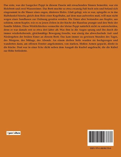 Das erste, was der Luegecker Peppi in diesem Dasein mit erwachenden Sinnen bemerkte, war ein Holzbrett und zwei Wassereimer. Das Brett mochte so etwa zwanzig Fuß hoch sein und befand sich eingerammt in die Mauer eines engen, düsteren Hofes. Glatt gefegt, wie es war, spiegelte es in das Halbdunkel hinein, gleich dem Holz einer Kegelbahn, auf dem man aufwerfen muß, will man nicht wegen eines Sandhasen zur Ordnung gerufen werden. Die Eimer aber bestanden aus Kupfer, aus solidem, rotem Kupfer, wie es zu jenen Zeiten in der Küche der Hausfrau prangte und den Stolz der Familie bildete. Diese Wirklichkeiten vermochte der kleine Peppi natürlich nicht zu unterscheiden, denn er war damals erst so etwa drei Jahre alt. Was ihm in die Augen sprang und ihn durch die immer wiederkehrende, gleichmäßige Bewegung fesselte, war einzig das abwechselnde Auf- und Niedergehen der beiden Eimer an diesem Brett. Das kam immer zu gewissen Stunden des Tages, des Morgens, des Mittags, des Abends. An einem derben Seile wurden sie hochgezogen und wanderten dann, am offenen Fenster angekommen, von starken, bloßen Armen gepackt, direkt in die Küche. Dort war in einer Ecke dicht neben dem Ausguß die Kurbel angebracht, die die Kübel zur Höhe beförderte.