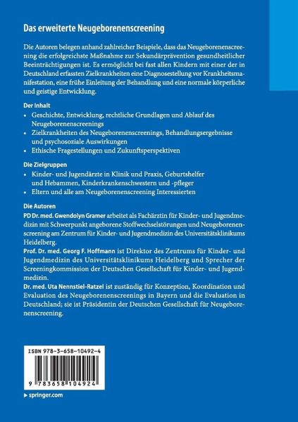 "... Als Zielgruppe für diese Publikation kommen vor allem Kinderärzte in Klinik und Praxis in Frage, aber auch Geburtshelfer, Hebammen, Kinderkrankenschwestern und -pfleger. ... einen vollstandigen Überblick über das Neugeborenenscreening und kann damit allen an diesem Thema Interessierten empfohlen werden." (Dr. P. Heister, in: Geburtshilfe und Frauenheilkunde, Jg. 76, Heft 5, Mai 2016)