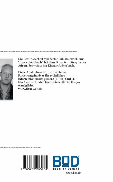 Die Seminararbeit von Stefan MC Helmrich zum "Executive Coach" bei dem Dozenten Fürsprecher Adrian Schweizer im Kloster Aldersbach.Diese Ausbildung wurde durch das Forschungsinstitut für rechtliches Informationsmanagement (FIRM) GmbH, ein An-Institut der FernUniversität in Hagen ermöglicht.