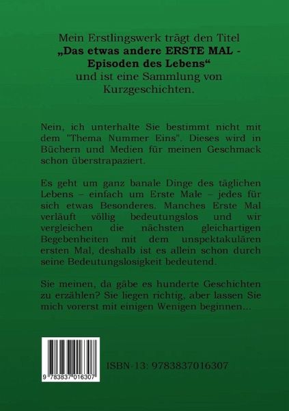 Mein Erstlingswerk trägt den Titel - "Das etwas andere ERSTE MAL - Episoden des Lebens" und ist eine Sammlung von Kurzgeschichten.Nein, ich unterhalte Sie bestimmt nicht mit dem Thema Nummer 1. Dieses wird in Büchern und den Medien für meinen Geschmack fast schon überstrapaziert. Es geht um ganz banale Dinge des täglichen Lebens, einfach um Erste Male, Jedes für sich etwas Besonderes. Manches Erste Mal verläuft völlig bedeutungslos und wir vergleichen die nächsten gleichartigen Begebenheiten mit dem unspektakulären Ersten Mal, deshalb ist es allein schon durch seine Bedeutungslosigkeit bedeutend. Sie meinen da gäbe es hunderte Geschichten zu erzählen? Sie liegen richtig, aber lassen Sie mich vorerst mit einigen Wenigen beginnen...