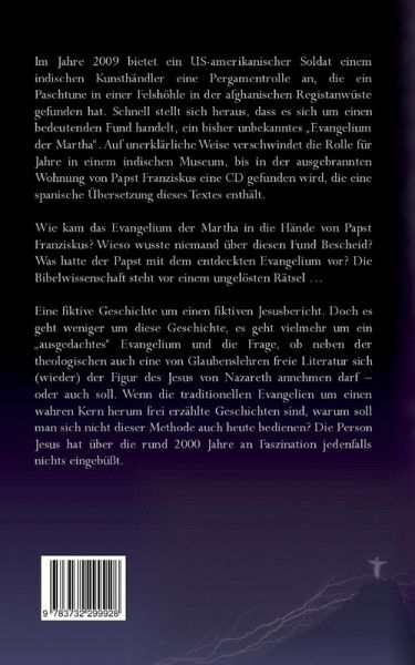 Im Jahre 2009 bietet ein US-amerikanischer Soldat einem indischen Kunsthändler eine Pergamentrolle an, die ein Paschtune in einer Felshöhle in der afghanischen Registanwüste gefunden hat. Schnell stellt sich heraus, dass es sich um einen bedeutenden Fund handelt, ein bisher unbekanntes "Evangelium der Martha". Auf unerklärliche Weise verschwindet die Rolle für Jahre in einem indischen Museum, bis in der ausgebrannten Wohnung von Papst Franziskus eine CD gefunden wird, die eine spanische Übersetzung dieses Textes enthält. Wie kam das Evangelium der Martha in die Hände von Papst Franziskus? Wieso wusste niemand über diesen Fund Bescheid? Was hatte der Papst mit dem entdeckten Evangelium vor? Die Bibelwissenschaft steht vor einem ungelösten Rätsel ...Eine fiktive Geschichte um einen fiktiven Jesusbericht. Doch es geht weniger um diese Geschichte, es geht vielmehr um ein "ausgedachtes" Evangelium und die Frage, ob neben der theologischen auch eine von Glaubenslehren freie Literatur sich (wieder) der Figur des Jesus von Nazareth annehmen darf - oder auch soll. Wenn die traditionellen Evangelien um einen wahren Kern herum frei erzählte Geschichten sind, warum soll man sich nicht dieser Methode auch heute bedienen? Die Person Jesus hat über die rund 2000 Jahre an Faszination jedenfalls nichts eingebüßt.