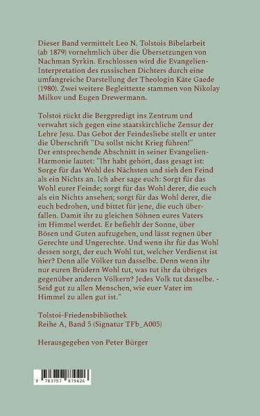 Dieser Band vermittelt Leo N. Tolstois Bibelarbeit (ab 1879) vornehmlich über die Übersetzungen von Nachman Syrkin. Erschlossen wird die Evangelien-Interpretation des russischen Dichters durch eine umfangreiche Darstellung der Theologin Käte Gaede (1980). Zwei weitere Begleittexte stammen von Nikolay Milkov und Eugen Drewermann.Tolstoi rückt die Bergpredigt ins Zentrum und verwahrt sich gegen eine staatskirchliche Zensur der Lehre Jesu. Das Gebot der Feindesliebe stellt er unter die Überschrift "Du sollst nicht Krieg führen!" Der entsprechende Abschnitt in seiner Evangelienharmonie lautet: "Ihr habt gehört, dass gesagt ist: Sorge für das Wohl des Nächsten und sieh den Feind als ein Nichts an. Ich aber sage euch: Sorgt für das Wohl eurer Feinde; sorgt für das Wohl derer, die euch als ein Nichts ansehen; sorgt für das Wohl derer, die euch bedrohen, und bittet für jene, die euch überfallen. Damit ihr zu gleichen Söhnen eures Vaters im Himmel werdet. Er befiehlt der Sonne, über Bösenund Guten aufzugehen, und lässt regnen über Gerechte und Ungerechte. Und wenn ihr für das Wohl dessen sorgt, der euch Wohl tut, welcher Verdienst ist hier? Denn alle Völker tun dasselbe. Denn wenn ihr nur euren Brüdern Wohl tut, was tut ihr da übriges gegenüber anderen Völkern? Jedes Volk tut dasselbe. - Seid gut zu allen Menschen, wie euer Vater im Himmel zu allen gut ist."Tolstoi-FriedensbibliothekReihe A, Band 5 (Signatur TFb_A005)Herausgegeben von Peter Bürger