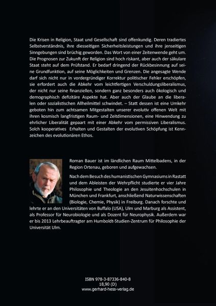 Die Krisen in Religion, Staat und Gesellschaft sind offenkundig. Deren tradiertes Selbstverständnis, ihre diesseitigen Sicherheitsleistungen und ihre jenseitigen Sinngebungen sind brüchig geworden. Das Wort von einer Zeitenwende geht um. Die Prognosen zur Zukunft der Religion sind hoch riskant, aber auch der säkulare Staat steht auf dem Prüfstand. Er bedarf dringend der Rückbesinnung auf seine Grundfunktion, auf seine Möglichkeiten und Grenzen. Die angesagte Wende darf sich nicht nur in vordergründiger Korrektur politischer Fehler erschöpfen, sie erfordert auch die Abkehr vom leichtfertigen Verschuldungsliberalismus, der nicht nur seine finanziellen, sondern ganz besonders auch ökologisch und demographisch defizitäre Aspekte hat. Aber auch der Glaube an die liberalen oder sozialistischen Allheilmittel schwindet. - Statt dessen ist eine Umkehr geboten hin zum achtsamen Mitgestalten unserer evolutiv offenen Welt mit ihren kosmisch langfristigen Raum- und Zeit dimensionen, eine Hinwendung zu ehrlicher Liberalität gepaart mit einer Abkehr vom permissiven Liberalismus. Solch kooperatives Erhalten und Gestalten der evolutiven Schöpfung ist Kennzeichen des evolutionären Ethos.