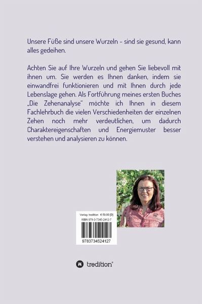 Unsere Füße sind unsere Wurzeln - sind sie gesund, kannalles gedeihen.Achten Sie auf Ihre Wurzeln und gehen Sie liebevoll mitihnen um. Sie werde es Ihnen danken, indem sieeinwandfrei funktionieren und mit Ihnen durch jedeLebenslage gehen. Als Fortführung meines ersten Buches"Die Zehenanalyse" möchte ich Ihnen in diesemFachlehrbuch die vielen Verschiedenheiten der einzelnenZehen noch mehr verdeutlichen, um dadurchCharaktereigenschaften und Energiemuster besserverstehen und analysieren zu können.
