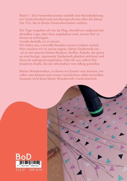 Entdecke eine neue Zauberwelt mit unseren Lieblingen: Vivi die Zauberfee und ihrem Kumpel Sam das Eulchen.Was erwartet dich:Wir basteln Vivi´s Wohnzimmer - Das Feenwohnzimmer, in eine Schachtel.Dort in ihren Räumlichkeiten, übt die kleine Fee Vivi das Zaubern.Sie lernt so einiges in der Feenschule, so versucht sie sich in einem Zauberspruch.Ein Effekt dazu wird mit gebastelt.Ist die Zauberwelt fertiggestellt, erwartet dich eine Kurzgeschichte über die Zauberfee und ihren Versuch, das Gelernte umzusetzen.Ich wünsche euch ganz viel Freude und vergnügliche Bastelstunden.Bis bald in der Zauberwelt.