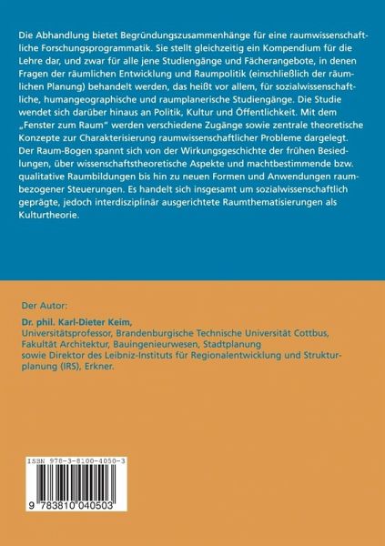 Die Abhandlung bietet Begründungszusammenhänge für eine raumwissenschaftliche Forschungsprogrammatik. Sie stellt gleichzeitig ein Kompendium für die Lehre dar, und zwar für alle jene Studiengänge und Fächerangebote, in denen Fragen der räumlichen Entwicklung und Raumpolitik (einschließlich der räumlichen Planung) behandelt werden, das heißt vor allem, für sozialwissenschaftliche, humangeographische und raumplanerische Studiengänge. Die Studie wendet sich darüber hinaus an Politik, Kultur und Öffentlichkeit. Mit dem "Fenster zum Raum" werden verschiedene Zugänge sowie zentrale theoretische Konzepte zur Charakterisierung raumwissenschaftlicher Probleme dargelegt. Der Raum-Bogen spannt sich von der Wirkungsgeschichte der frühen Besiedlungen, über wissenschaftstheoretische Aspekte und machtbestimmende bzw. qualitative Raumbildungen bis hin zu neuen Formen und Anwendungen raumbezogener Steuerungen. Es handelt sich insgesamt um sozialwissenschaftlich geprägte, jedoch interdisziplinär ausgerichtete Raumthematisierungen als Kulturtheorie.