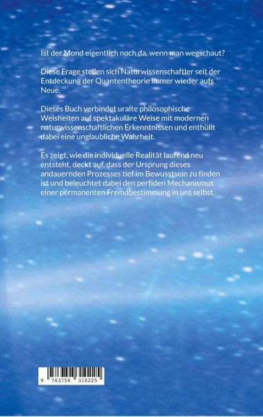 Ist der Mond eigentlich noch da, wenn man wegschaut?Diese Frage stellen sich Naturwissenschaftler seit der Entdeckung der Quantentheorie immer wieder aufs Neue.Dieses Buch verbindet uralte philosophische Weisheiten auf spektakuläre Weise mit modernen naturwissenschaftlichen Erkenntnissen und enthüllt dabei eine unglaubliche Wahrheit.Es zeigt, wie die individuelle Realität laufend neu entsteht, deckt auf, dass der Ursprung dieses andauernden Prozesses tief im Bewusstsein zu finden ist und beleuchtet dabei den perfiden Mechanismus einer permanenten Fremdbestimmung in uns selbst.