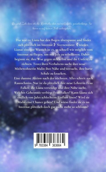 Das war es: Liana hat den Bogen überspannt und findet sich plötzlich im Internat Sternenmeer wieder.Lianas einziger Wunsch ist es, so schnell wie möglich vom Internat zu fliegen, um mit Jule zu rebellieren. Daher beginnt sie, ihre Wut gegen sich selbst und ihr Umfeld zu richten. Trotz ihres Verhaltens sucht ihre neue Mitbewohnerin Malin ihre Nähe und versucht, ihre harte Schale zu knacken.Eine dumme Aktion nach der nächsten. Alles schreit nach Rausschmiss. Nur ist da plötzlich ihre neue Lehrerin Frau Falkee, die Liana verteidigt und ihre Nähe sucht.Welches Geheimnis verbirgt Frau Falkee? Kann Liana sich endlich von Jules schlechtem Einfluss lösen? Wird sie Malin eine Chance geben? Und wieso findet sie es im Internat plötzlich doch gar nicht mehr so schlimm?